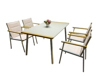 Bàn ăn khung nhôm và ghế đặt với ghế màu be & cạnh vàng cho hiên ngoài trời
